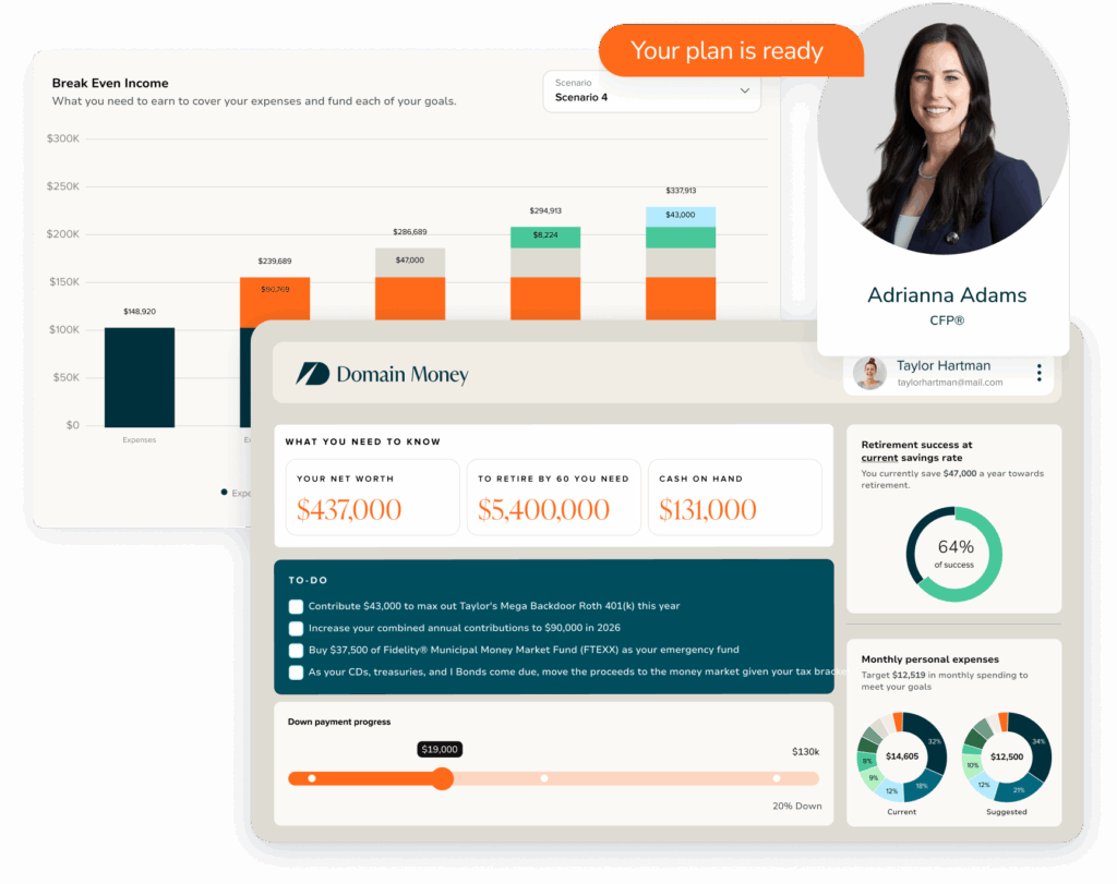 Domain Money’s advisors are CFP® professionals–which means they’re not incentivized to sell products or steer you toward specific investments, but are focused on what’s right for you.